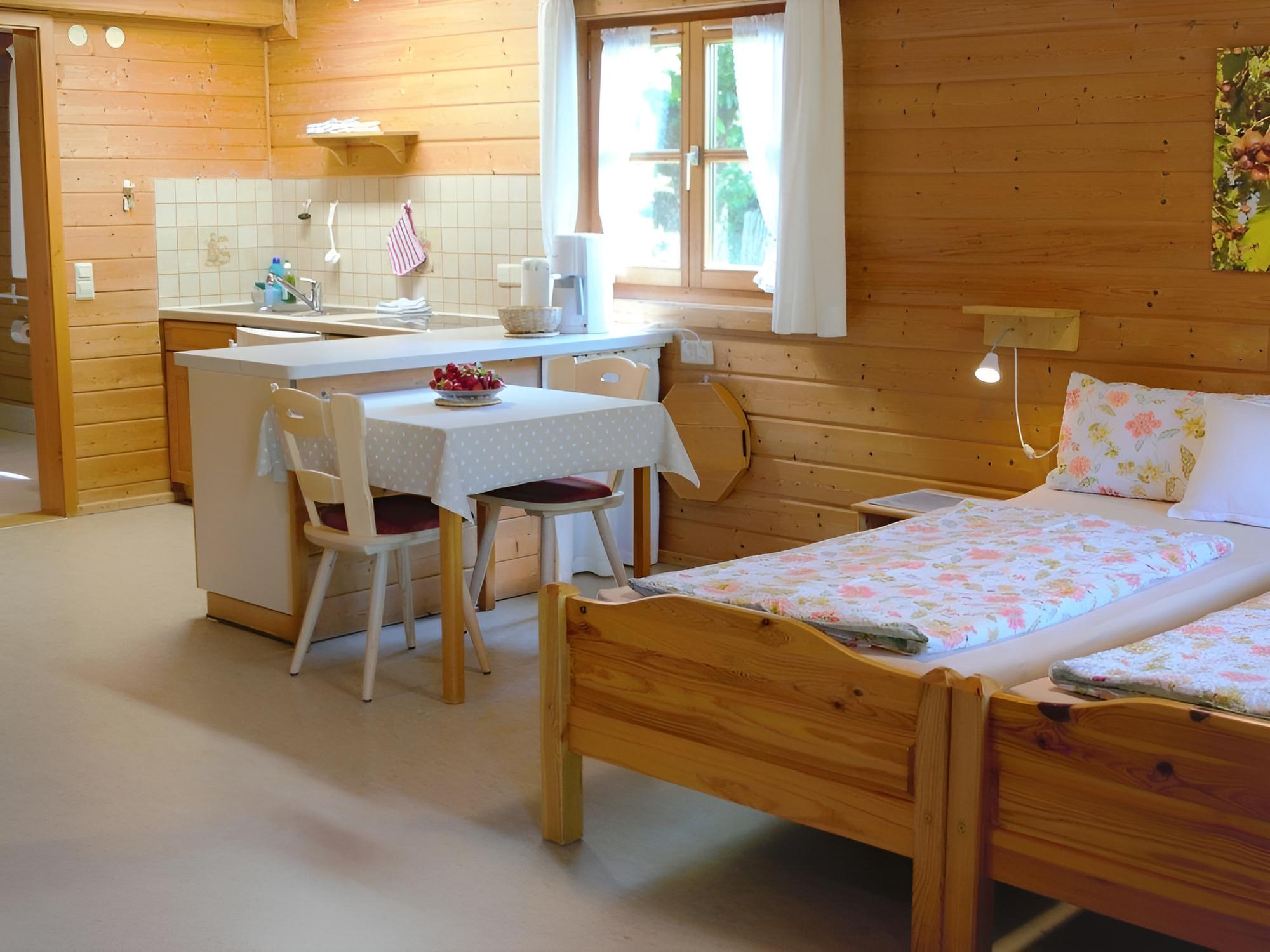 Der Schlafraum bietet zwei Betten mit verstellbarem Kopf- und Fußteil, während die Küchenecke alles Nötige für gemütliche Mahlzeiten bereithält. Die geräumige DU/WC kommt ohne Duschwanne, Türenbreite 1 m sorgt für leichten Zugang. Sonne und Komfort erwarten dich auf der Südterrasse.