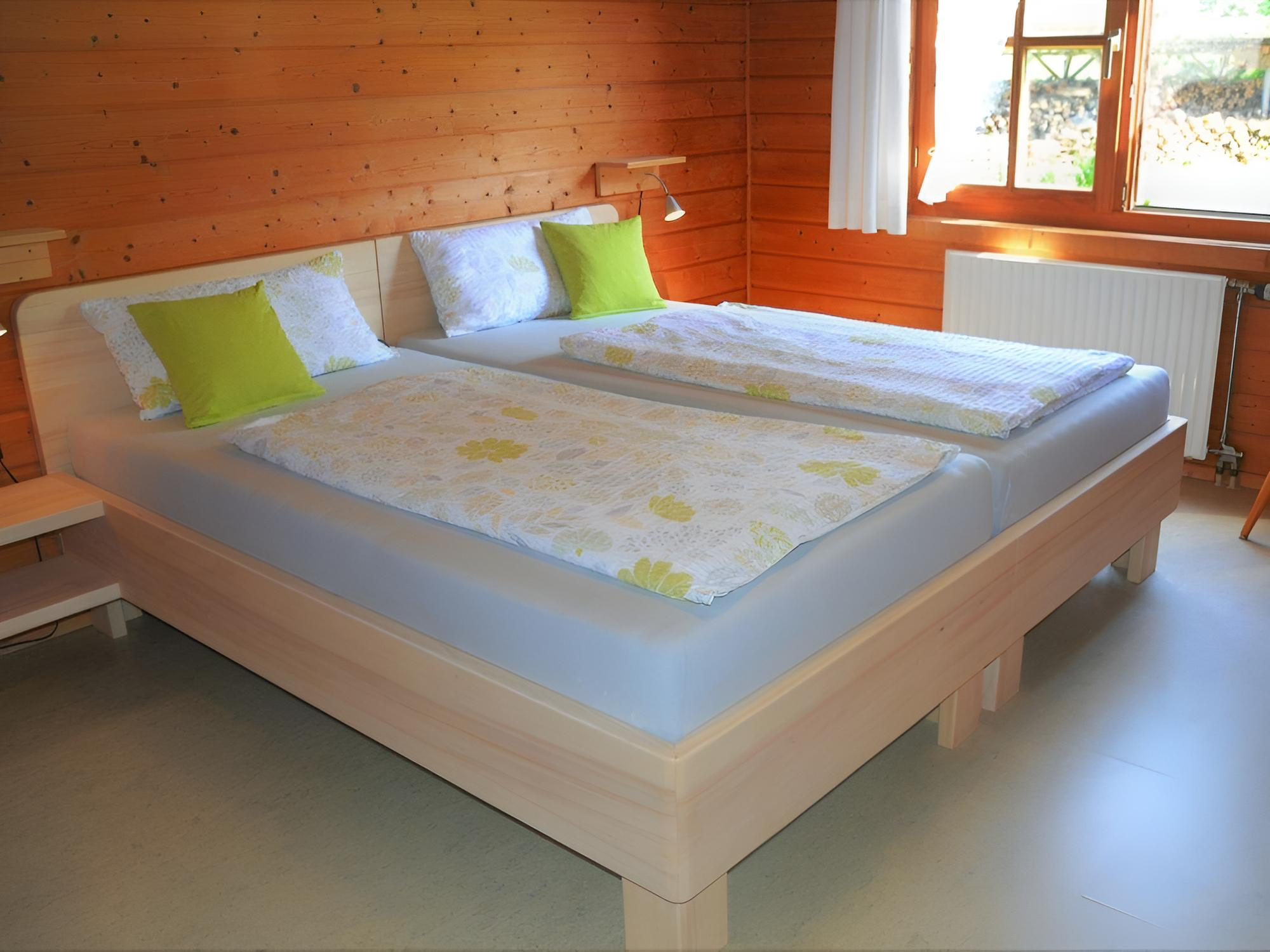Die Wohnung umfasst ein Doppelzimmer mit zwei Einzelbetten aus Weißtanne (je 2 m x 1 m), sowie ein zusätzliches Einzelzimmer, Wohnraum und eine gut ausgestattete Küchenzeile. Eine gemütliche Eckbank aus Weißtanne lädt zum Verweilen ein. Die geräumige DU/WC kommt ohne Duschwanne und bietet eine Türenbreite von 1 m für leichten Zugang.
